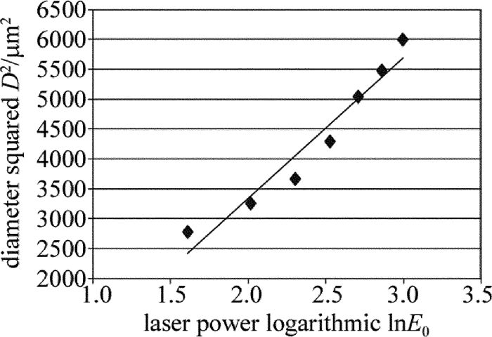 目前確定燒蝕閾值的方法主要有在線觀測、形貌檢測及數(shù)值計算等。本實驗中采用數(shù)值計算的方法并輔以顯微觀測,推導出燒蝕直徑D與脈沖激光能量E的函數(shù)關系,將線性曲線外推至D=0處,從而得出材料的破壞閾值,同時還能夠獲得光束的焦點半徑。