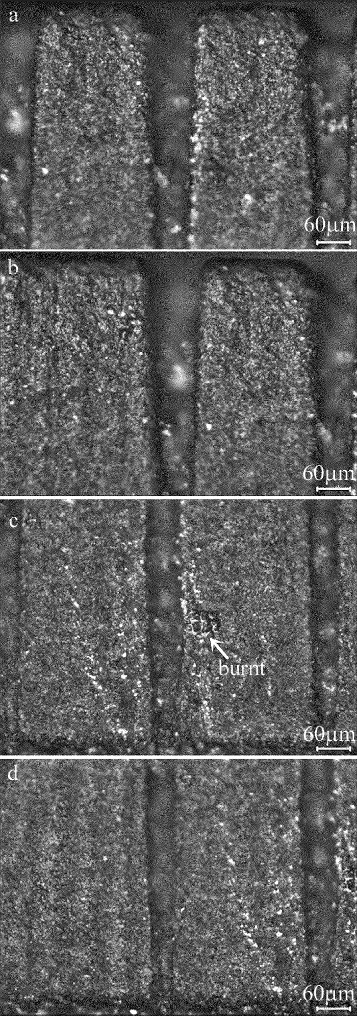 進行工藝試驗時,采用打孔方式來計算得出PCBN在該條件下的燒蝕閾值,通過切割試驗獲得各切割參量對切割質(zhì)量的影響。實驗完成后,采用MV6000金相顯微鏡對切縫表面和側面進行測量和分析。