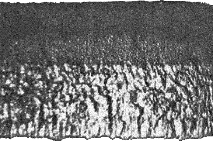 圖 7為不同頻率下縫寬和錐度的變化曲線。其中激光功率20W,切割速率30mm/min,脈沖頻率分別為30Hz, 40Hz, 50Hz, 60Hz。從圖中看出,激光脈沖頻率對切縫寬度影響大。隨著頻率的增大,縫寬顯著減小,同時切割錐度也隨之減小。脈沖頻率的大小決定著激光光斑的重疊程度,圖 8為PCBN激光切割、掰片、簡單去熔渣后斷面形貌圖。上層為PCBN,下層為硬質(zhì)合金。圖中能明顯看出切割后的條紋形狀。根據(jù)單脈沖激光能量E與平均輸出功率Pave和脈沖頻率f的關系式E=Pave/f可知,隨著脈沖頻率的增加,單脈沖能量減小,光斑重疊度增大,這對表面切割質(zhì)量的提高和裂紋的減少起著重要作用。