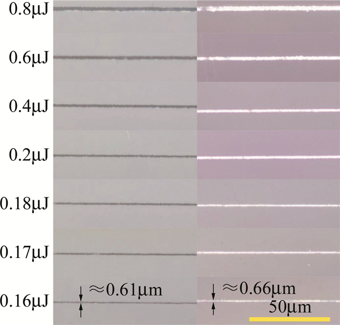 激光直寫刻蝕玻璃方法,按激光波長(zhǎng)不同主要分為紅外和紫外激光刻蝕法,而按照激光脈寬不同則可分為:連續(xù)激光刻蝕;納秒、皮秒及飛秒激光刻蝕。YANG等人使用248nm深紫外準(zhǔn)分子激光在石英玻璃表面刻蝕微通道,試驗(yàn)中發(fā)現(xiàn)激光能量密度是決定石英玻璃發(fā)生刻蝕及裂損的主要因素,無(wú)裂損刻蝕石英玻璃的激光能量密度閾值區(qū)間應(yīng)在16J/cm2~30J/cm2;而掃描次數(shù)的增加、重復(fù)頻率和微通道深度的增大也會(huì)加劇微通道的裂損程度,最后通過加工參量的優(yōu)化(激光能量密度23.5J/cm2,圓弧段重頻為50Hz,直線段重頻為40Hz,掃描1次)實(shí)現(xiàn)了寬度小于100μm的直線型(深度不大于50μm)和圓弧型微通道(深度不大于28.5μm)的無(wú)裂損刻蝕。LI等人利用波長(zhǎng)為355nm, 脈寬為10ns~25ns的全固態(tài)紫外激光器直寫刻蝕BF33硼硅玻璃微通道,試驗(yàn)中采用單一變量法探究激光能量密度、重復(fù)頻率、掃描速率等參量對(duì)刻蝕效果的影響,試驗(yàn)結(jié)果表明,當(dāng)激光能量密度過大時(shí),玻璃易發(fā)生嚴(yán)重崩邊裂損現(xiàn)象,刻蝕深度減小;而隨著重復(fù)頻率的減小,通道碎裂現(xiàn)象減輕,刻蝕深度增大。YU等人采用波長(zhǎng)為1030nm、脈寬和重復(fù)頻率分別為290fs, 50kHz的飛秒激光器在石英玻璃樣品上刻蝕線寬小于1μm的凹槽圖案以制備亞微米金屬線,研究了不同脈沖能量激光與燒蝕凹槽及機(jī)械拋光后的金屬線的線寬之間的關(guān)系,如圖 1所示。結(jié)果表明,當(dāng)脈沖能量在0.18μJ以下時(shí),凹槽線寬已降低至1μm以下,最終在石英玻璃上制備出多種不同圖案且線寬穩(wěn)定控制在0.8μm左右的凹槽。