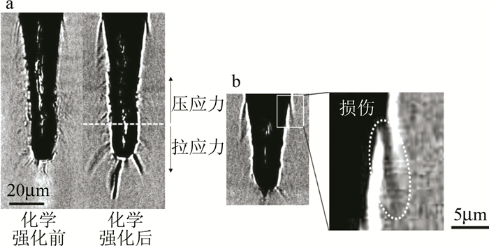超快激光由于作用時(shí)間非常短,加工時(shí)的熱滲透很小,在玻璃樣品上不會(huì)留下很大的熱影響區(qū)域,能夠有效地減少加工后微裂紋的產(chǎn)生。ARGUMENT使用波長(zhǎng)為248nm~800nm、脈寬為130fs~300fs的飛秒激光器在石英玻璃上加工出寬度在25μm~40μm,深度可達(dá)100μm的微孔,后續(xù)研究發(fā)現(xiàn)通過在加工前預(yù)熱玻璃基板,在玻璃基板上預(yù)先制備金屬鎢薄膜,加工后通過過氧化氫腐蝕去除的辦法可以有效地減少裂紋和碎片的產(chǎn)生。CHUANG等人利用波長(zhǎng)為1065nm的皮秒激光器在超薄玻璃上加工出一連串直徑為3μm、間隔為2μm~3μm的通孔,在掃描電子顯微鏡(scanning electron microscope,SEM)下觀察玻璃微孔橫截面發(fā)現(xiàn)沒有可見的熔化區(qū),這表明皮秒激光加工微孔時(shí)的熱影響區(qū)基本可以忽略不計(jì)。ITO等人對(duì)化學(xué)強(qiáng)化玻璃進(jìn)行飛秒激光打孔試驗(yàn), 并通過數(shù)值分析加工時(shí)的應(yīng)力波的傳播及溫度場(chǎng)的分布,發(fā)現(xiàn)制孔側(cè)壁和底部的殘余應(yīng)力主要是由應(yīng)力波引起的,而孔入口周圍的損傷則與熱應(yīng)力的弛豫有關(guān),如圖 6所示。WEI等人建立了基于飛秒激光抽運(yùn)-探測(cè)原理的時(shí)間分辨陰影成像平臺(tái),直接獲取了飛秒激光燒蝕石英微孔的超快過程圖像,如圖 7所示。通過對(duì)不同能量密度、時(shí)間延遲、脈沖條件下拍攝圖像的分析,發(fā)現(xiàn)在飛秒激光燒蝕制備石英微孔的過程中,當(dāng)能量密度低于石英玻璃破壞閾值時(shí),石英玻璃表面觀測(cè)到?jīng)_