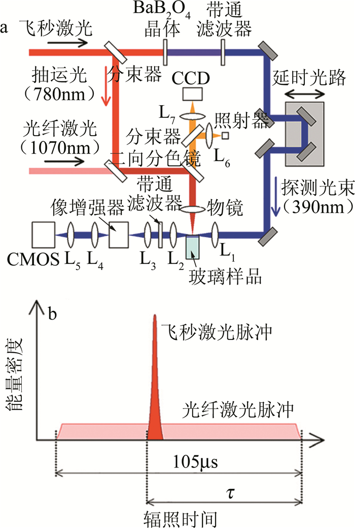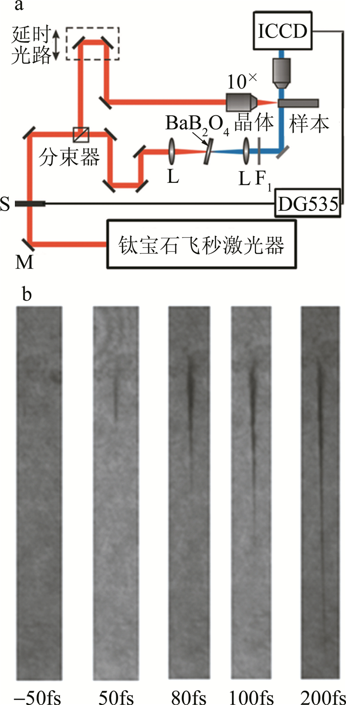 a—時(shí)間分辨陰影成像光路圖b—石英介質(zhì)中零延時(shí)附近的飛秒激光誘導(dǎo)的等離子通道
