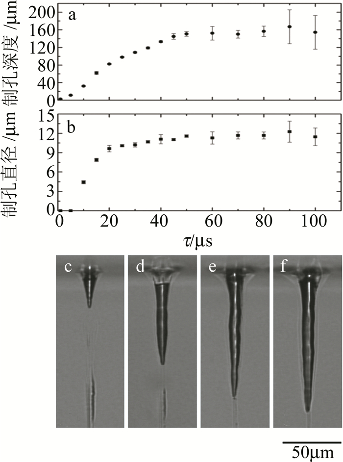 針對(duì)激光打孔過程中玻璃崩邊及裂紋現(xiàn)象嚴(yán)重,高深徑比微孔加工難度大的瓶頸問題,許多學(xué)者提出了改進(jìn)的打孔方法。為了減少微孔加工時(shí)裂紋的產(chǎn)生,KONO等人將二氧化鈰粉末和水的混合物涂覆到玻璃材料的表面后,晾干制成30μm的吸收層,之后再用波長(zhǎng)為355nm的納秒激光器進(jìn)行微孔加工,成功在硼硅玻璃和石英玻璃上分別加工出深徑比12以上的微孔,通過對(duì)照試驗(yàn)還發(fā)現(xiàn)該方法可以大大減少裂紋的產(chǎn)生,并在不影響加工質(zhì)量的前提下提高加工速度(XY工作臺(tái)進(jìn)給速率高達(dá)100μm/s)。針對(duì)飛秒激光打孔制孔速度低、制孔時(shí)易產(chǎn)生損傷的問題,ITO等人[19]將波長(zhǎng)為780nm的飛秒激光器與波長(zhǎng)為1070nm的光纖激光器相結(jié)合,如圖 8a所示,加工時(shí)首先使用飛秒激光在玻璃基板上加工出高寬深比的細(xì)線,之后將光纖激光輻照到細(xì)線上逐步獲得所需的微孔(其中在飛秒激光輻照后的光纖激光輻照時(shí)間定義為時(shí)間延遲τ,如圖 8b所示), 研究發(fā)現(xiàn), 飛秒激光產(chǎn)生的細(xì)線會(huì)選擇性地吸收光纖激光脈沖利用熱效應(yīng)去除材料,可以有效地避免直接飛秒激光加工過程產(chǎn)生的強(qiáng)應(yīng)力波對(duì)材料的損傷,制孔的直徑和深度與τ有關(guān),如圖 9所示。試驗(yàn)結(jié)果表明,該方法在40μs內(nèi)加工出了直徑為10μm、深度達(dá)133μm的微孔,制孔速度只采用飛秒激光加工的5000倍以上, 且能有效地抑制裂紋的產(chǎn)生。為了解決傳統(tǒng)打孔由上至下的加工方式制孔時(shí)出現(xiàn)的坡度效應(yīng)(制孔開口表現(xiàn)出入口大出口小的特征),WANG等人[20]提出在加工透明材料時(shí),嘗試采用由下至上的打孔方式代替常規(guī)的由上至下方式,將激光透過材料聚焦于材料的下表面,由底部開始一層層地將材料向上去除, 試驗(yàn)中分別采用波長(zhǎng)為532nm的納秒激光、波長(zhǎng)為1064nm的皮秒激光及波長(zhǎng)為515nm的飛秒激光在康寧大猩猩玻璃上加工孔徑為100μm~120μm、深度為200μm~900μm的微孔, 試驗(yàn)結(jié)果表明,在采用由下至上的加工方式時(shí),脈寬區(qū)間不存在死亡谷(自納秒開始,脈寬愈短,材料移除率愈低,在2ns~50ps之間移除率非常低),脈寬為2ns~50ps的激光切割效率高于超快激光,能夠?qū)崿F(xiàn)零錐度鉆孔且玻璃的崩邊尺寸小于50μm。